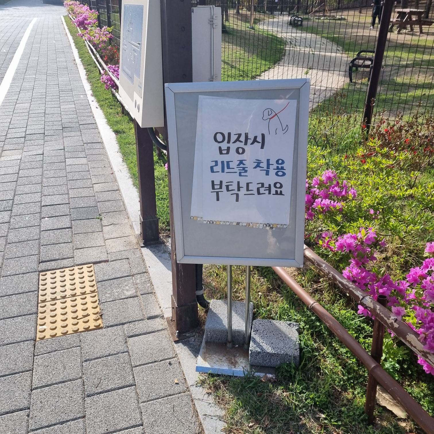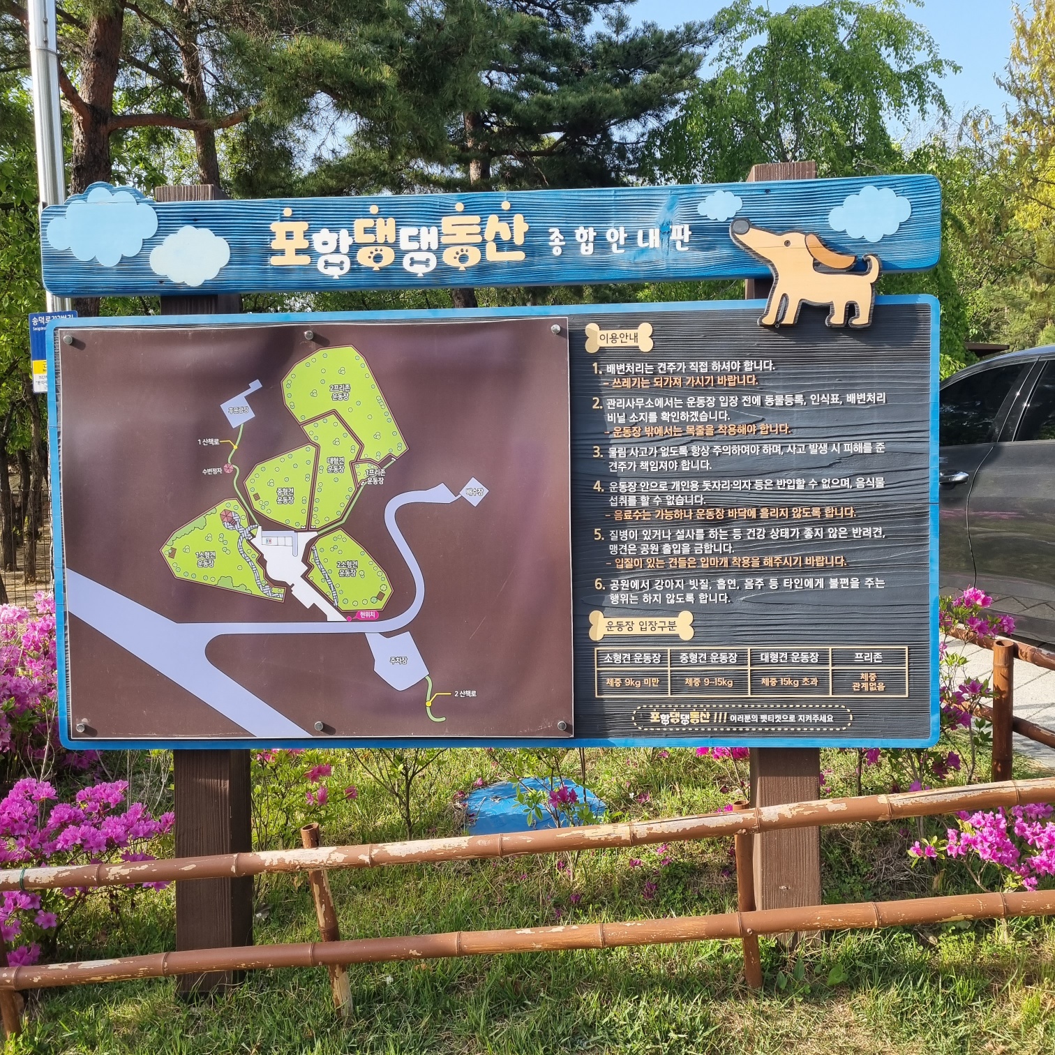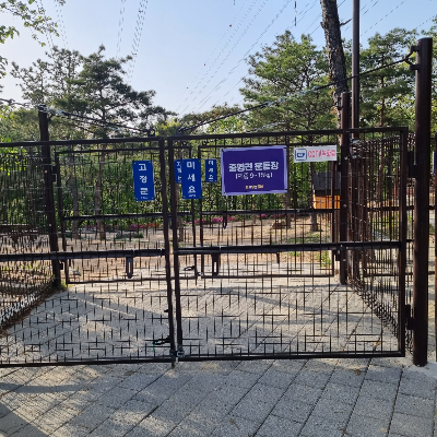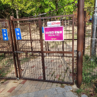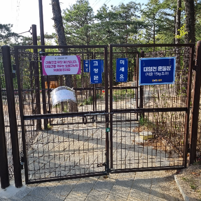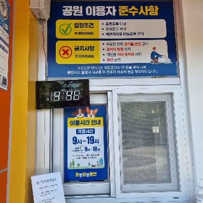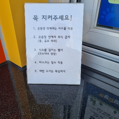 금지사항 : 운동장 안 음식물 반입 금지, 강아지 빗질 금지, 개인용 의자, 돗자리 금지, 흡연 금지.