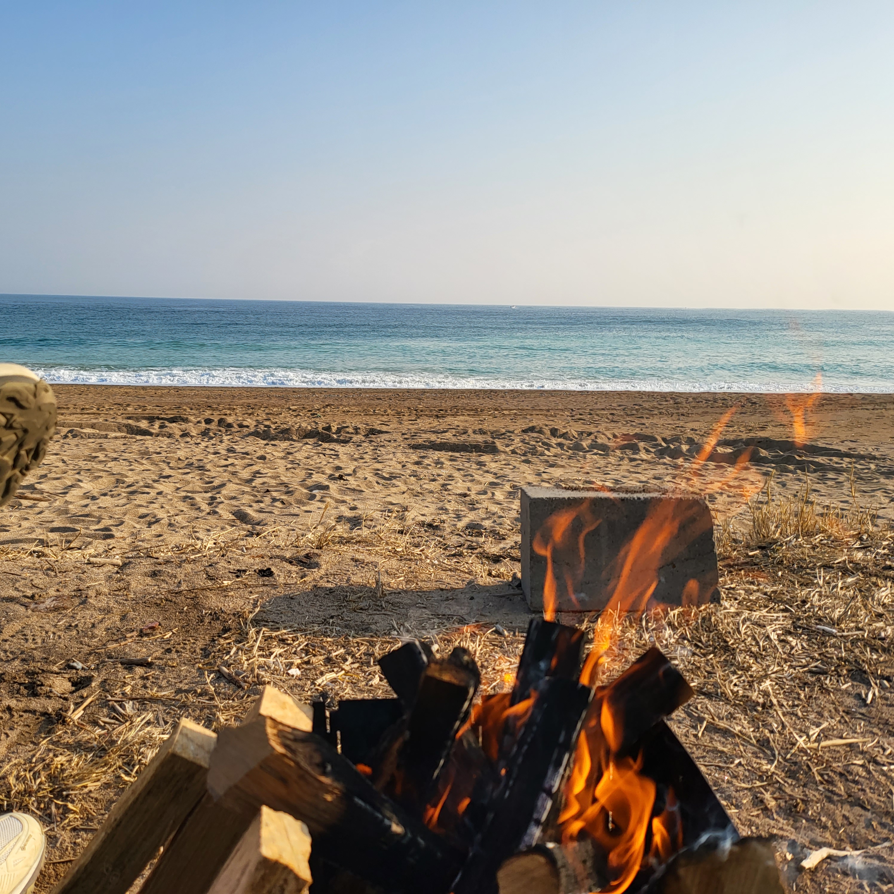 바닷바람은 아직 서늘하니 얼른 장작에 불을 지폈다.